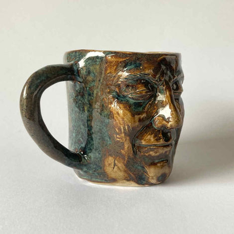 Neben Büsten fertige ich auch Porträts auf Tassen an. Die Tassen sind aus Keramik und die Gesichter sind darauf modelliert. Ich fertige sie in der Regel aus hellem Ton und biete verschiedene Möglichkeiten für die Glasur an.